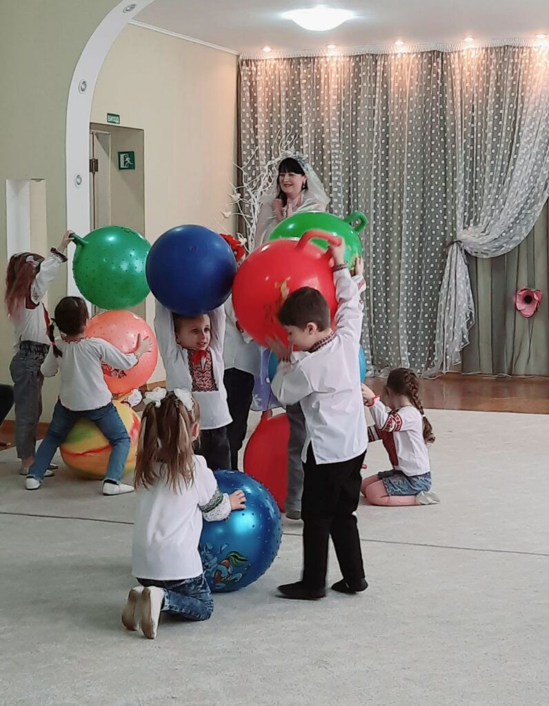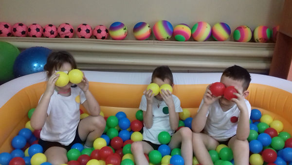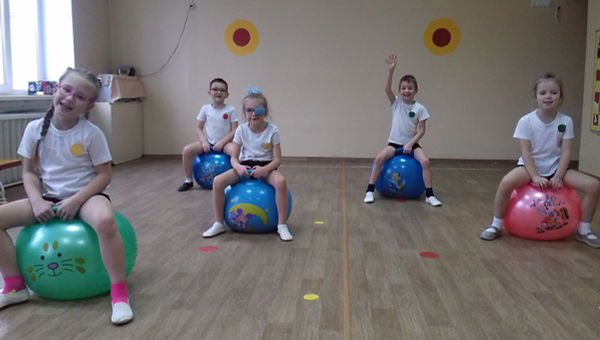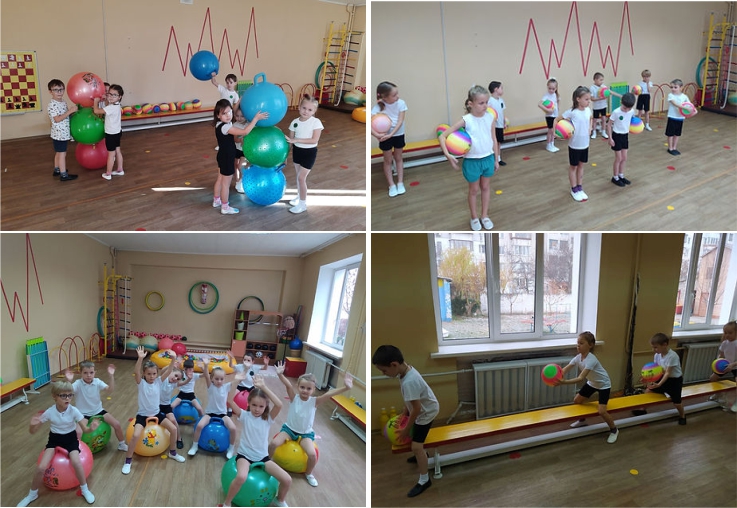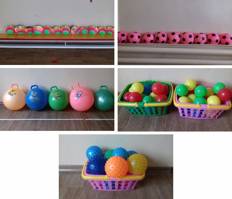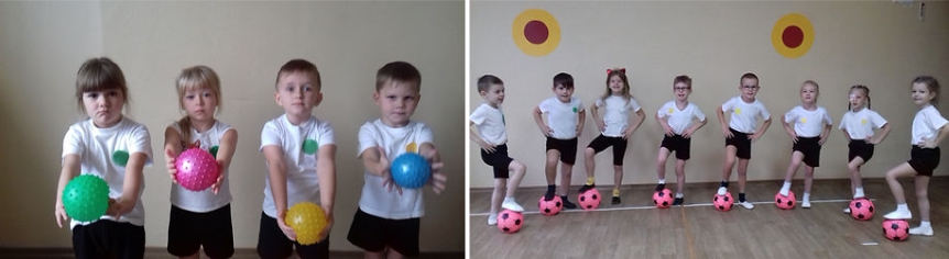 Ми працюємо з дітьми починаючи з 3-го року життя. У кожній групі і у фізкультурній залі є резинові м’ячі різного діаметру, пластикові кульки, надувні кульки, масажні м’ячики. У фізкультурній залі є м’ячі– фітболи по кількості дітей. У роботі з дітьми ми намагаємося використовувати м’ячі у повному обсязі під час ранкової гімнастики, під час фізкультурних занять (в загальнорозвиткових вправах і основних видах рухів), у режимних моментах, у самостійній діяльності, в індивідуальній роботі з дітьми в рухливих іграх. Наші діти з радістю котять м’ячі, бігають за ними, кидають їх.