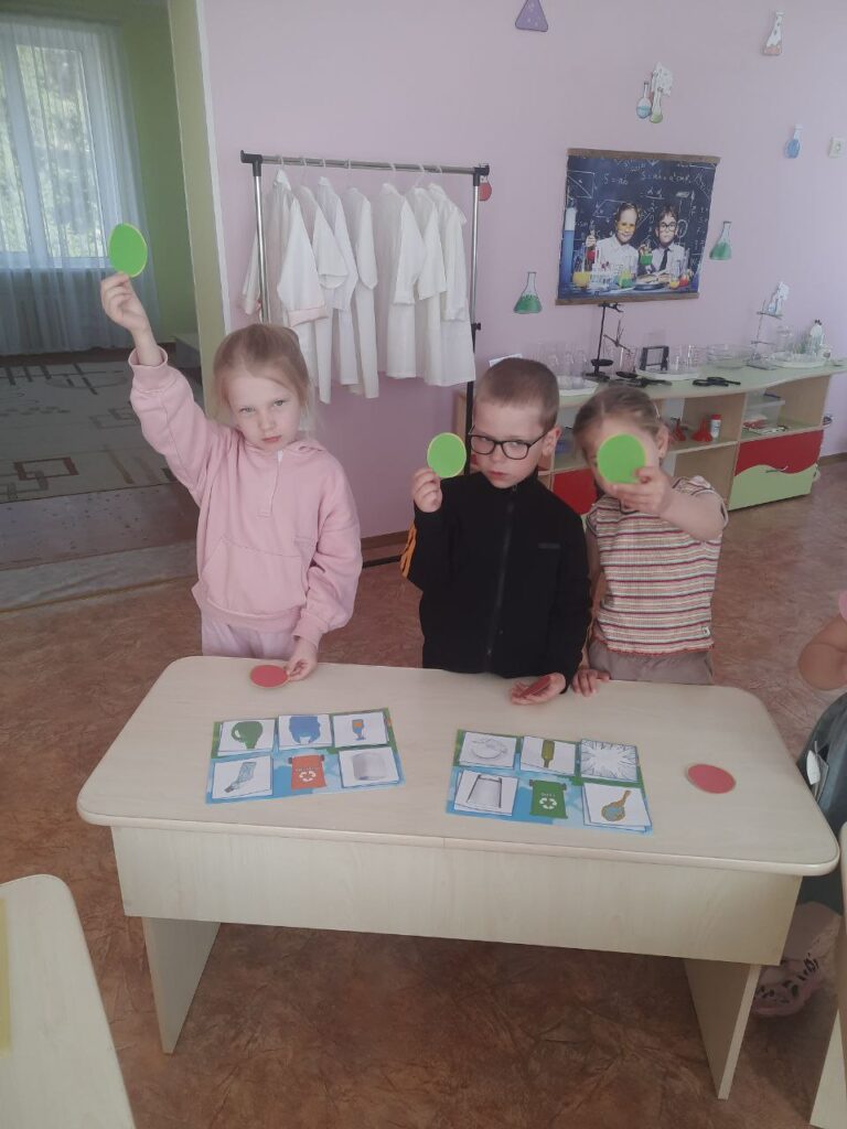 На занятті навчали дітей сортувати сміття, уточнили й розширили знання дітей про шкідливий вплив батарейок, ламп для економії світла на природнє довкілля; про небезпеку сміттєзвалищ; виховували екологічну свідомість.